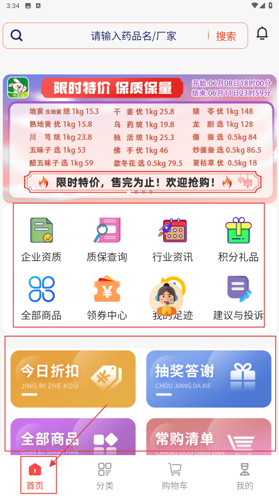 1、在应用【首页】,用搜索/功能入口(企业资质等)、活动板块(今日折扣等),找所需内容。