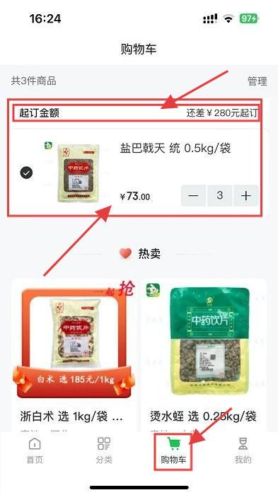 3、点【购物车】,查商品,改数量,达到起订金额即可购买。