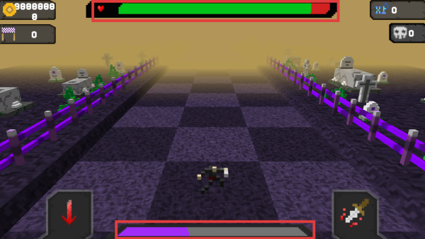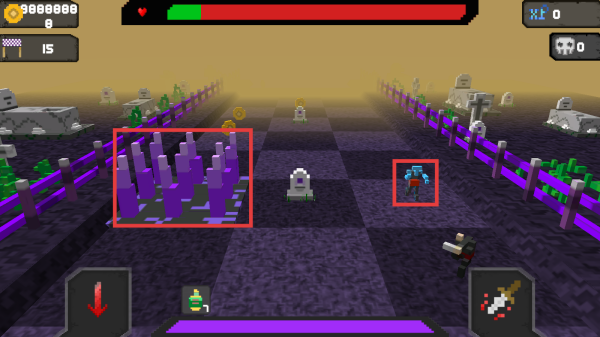 2、在前进过程中,躲避道路上如紫色尖刺等障碍物,避免生命值受损,遇到怪物(如蓝色僵尸形象)时,点击右下角武器图标进行攻击。