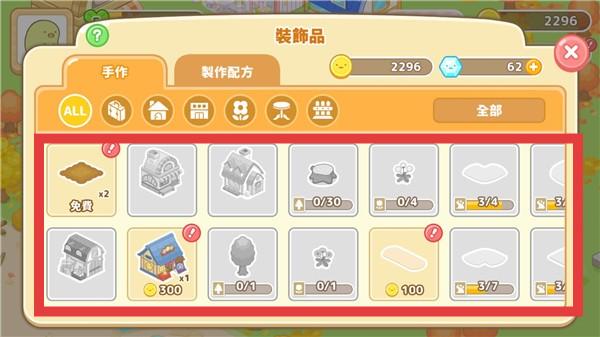 3、进入【装饰品】界面,查看手作和制作配方,根据已有材料(如兔窝x2等)及数量要求,制作装饰品,提升游戏中的装饰水平和收益。