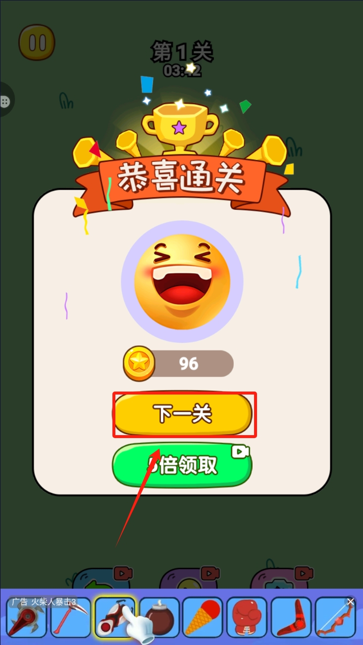3、最后,当你成功通关后,会弹出一个庆祝通关的界面。点击“下一关”按钮,继续挑战下一个关卡。