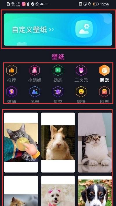2、切换到壁纸页,点【自定义壁纸】,按分类(萌宠、风景等)选壁纸。