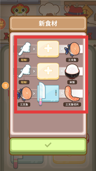 2、在【新食材】界面,了解可使用的食材(如轻盐、三文鱼、米饭等)及其加工方式,合理搭配食材制作菜品,丰富菜单。