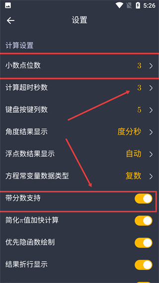 4、在设置页面,开启【带分数支持】开关,可让计算器支持带分数运算,丰富计算功能的适用场景。