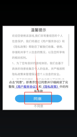 1、同意条款:点击“同意”按钮接受游戏条款。