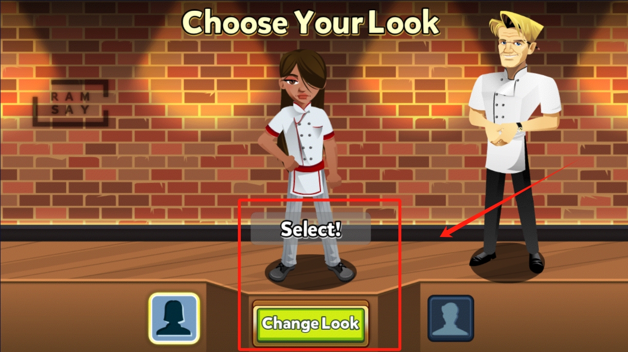3、选择外观:在游戏开始前,您需要选择您的厨师角色外观。点击“Select”按钮选择当前角色,或者点击“Change Look”按钮来更换不同的角色外观。