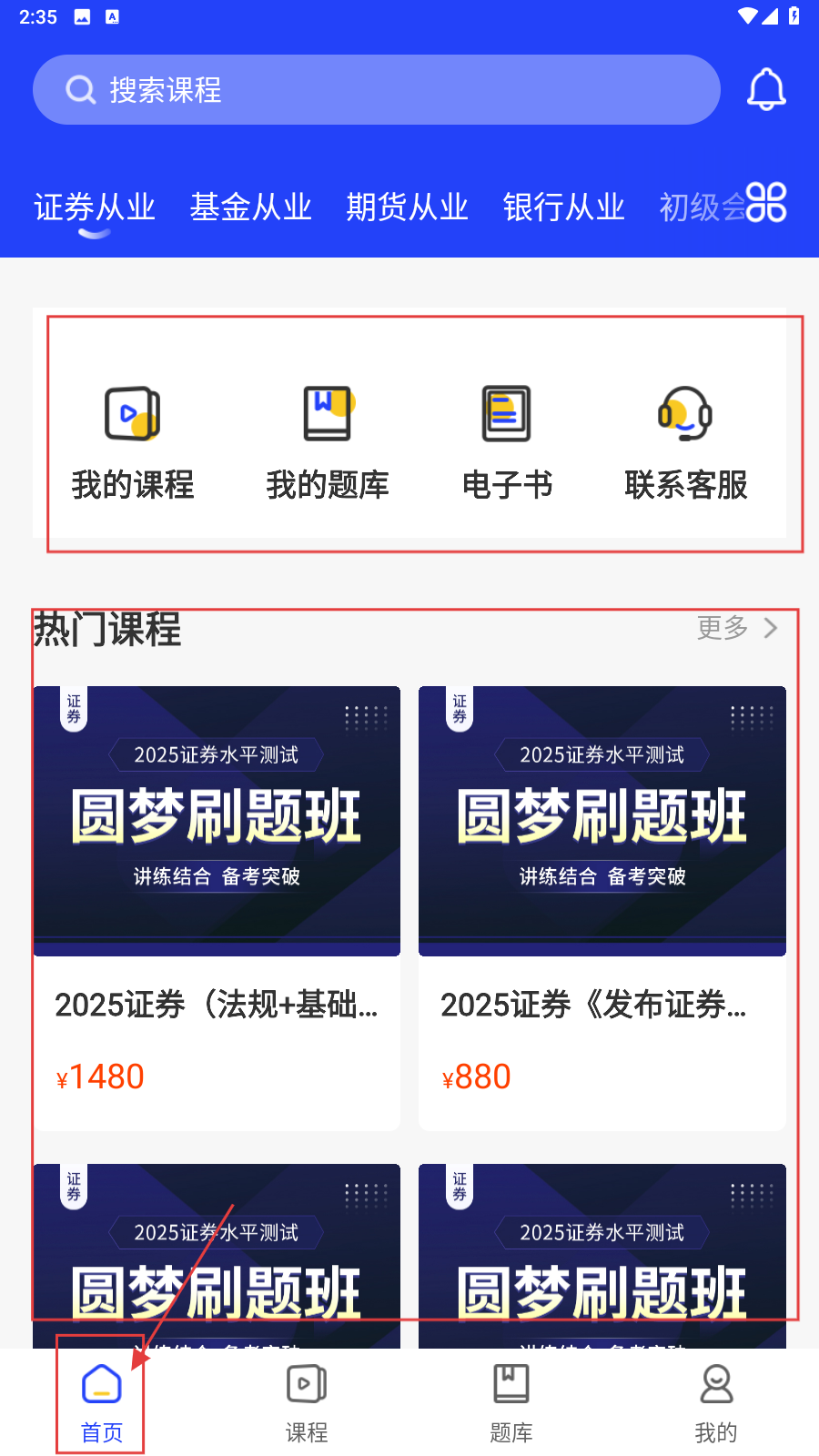 1、打开应用,在【首页】界面,可查看我的课程、热门课程等内容。