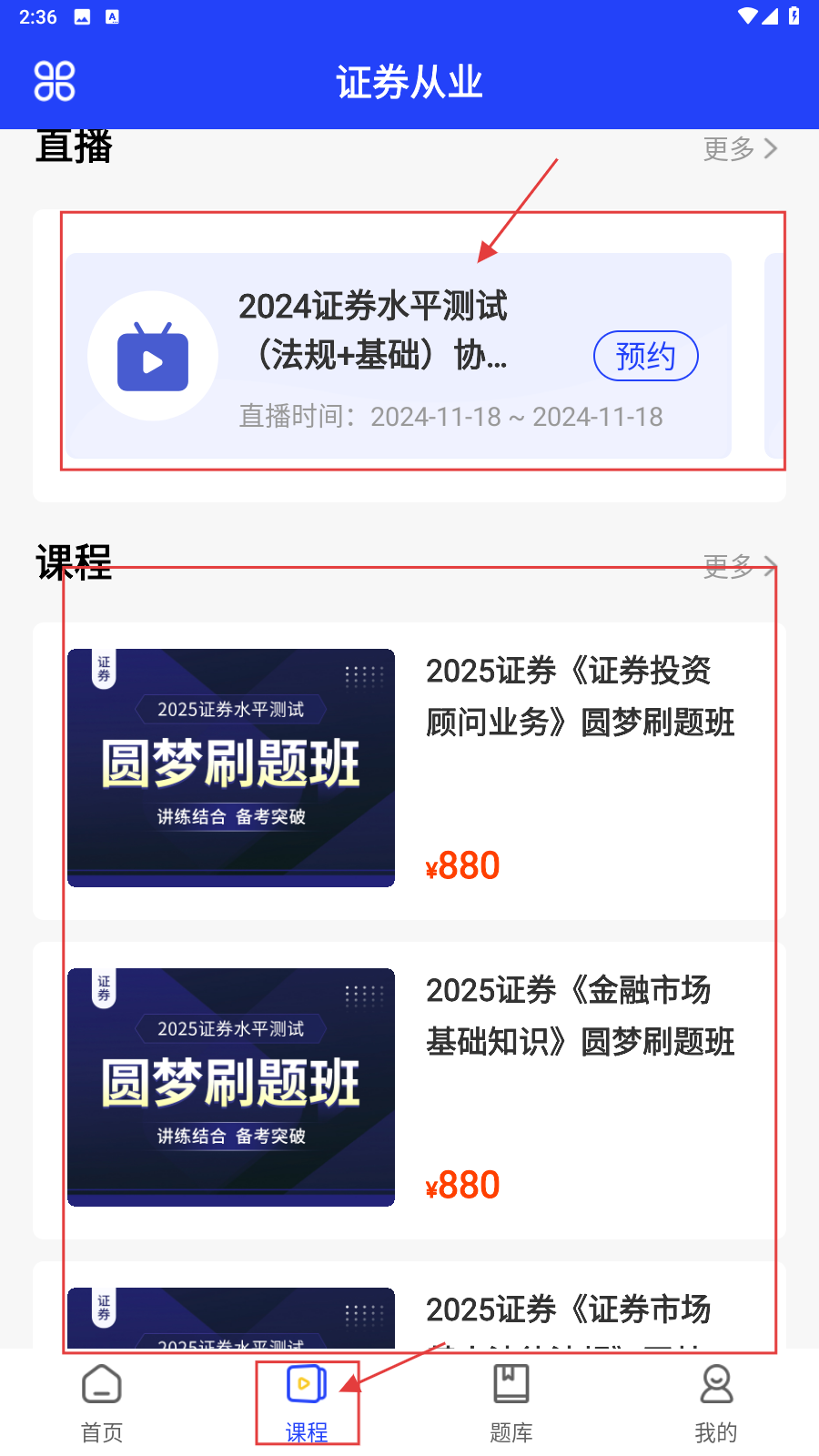 2、切换到【课程】页,选择证券从业分类下的直播或课程,进入课程详情。