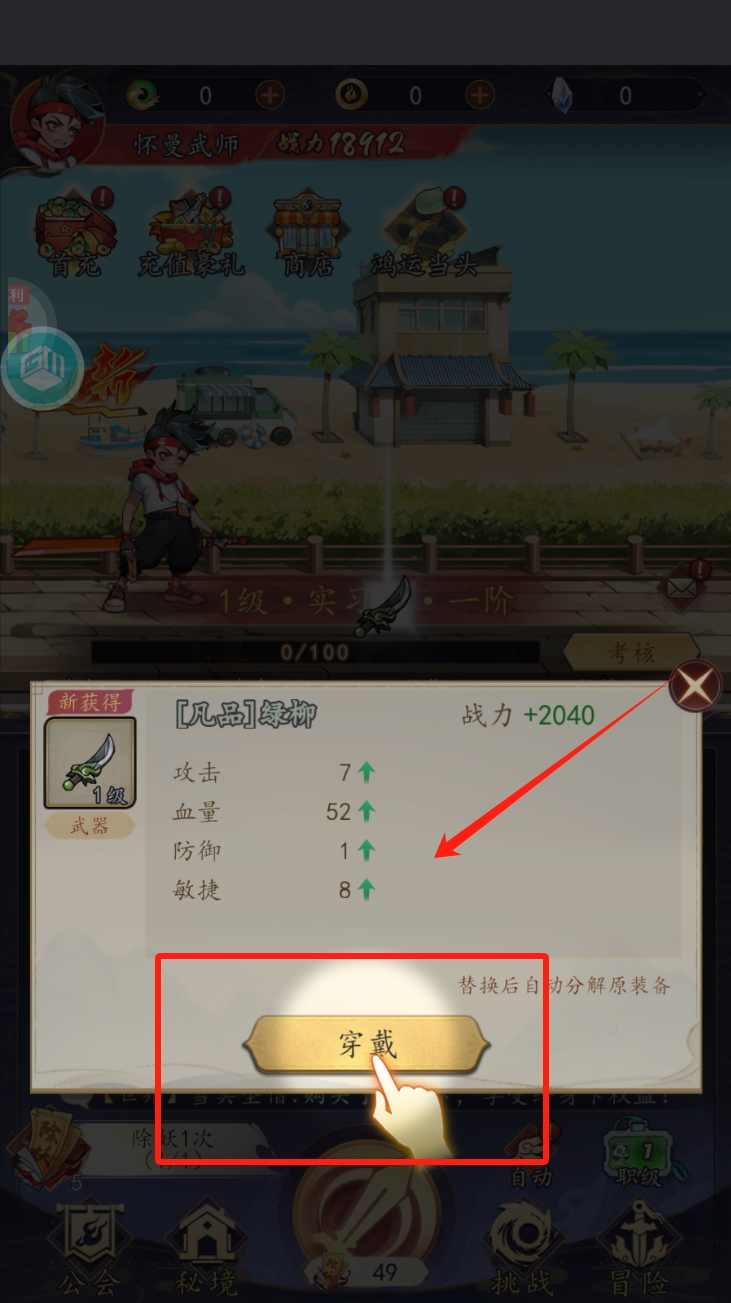 3、获得新装备后,点击“穿戴”按钮装备新装备。这将提升您的战斗力,使您在游戏中更加强大。