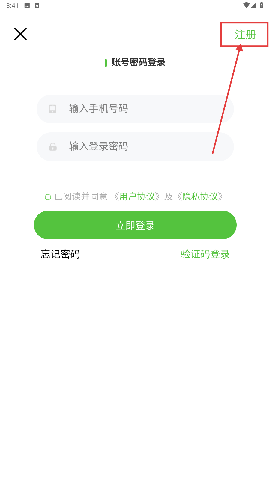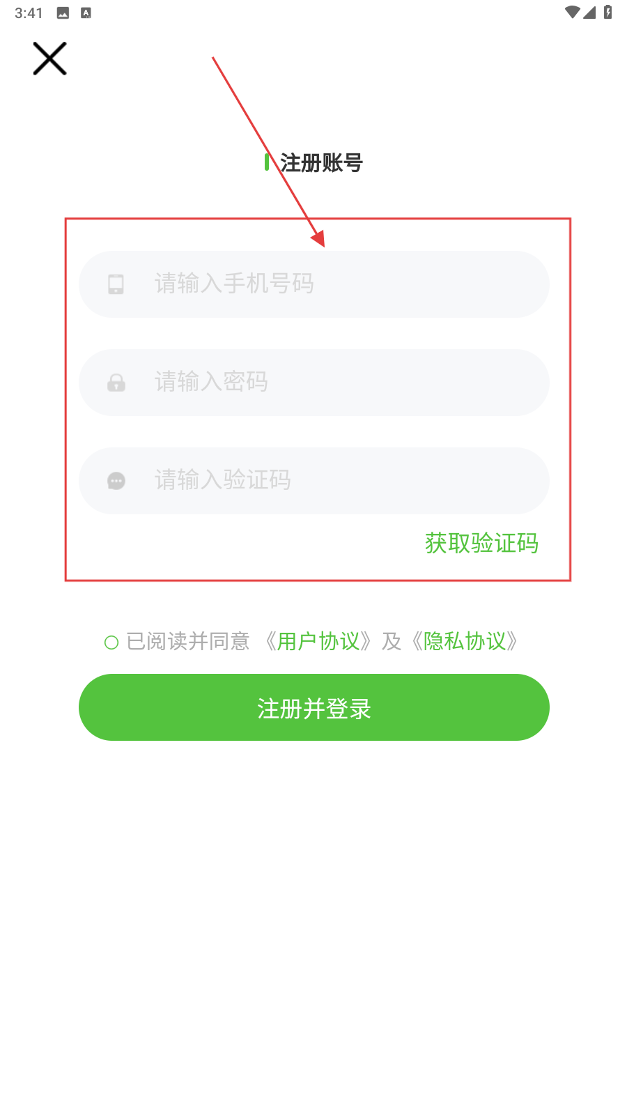 2、在注册页,依次填手机号码、密码,点【获取验证码】,填入收到的码。