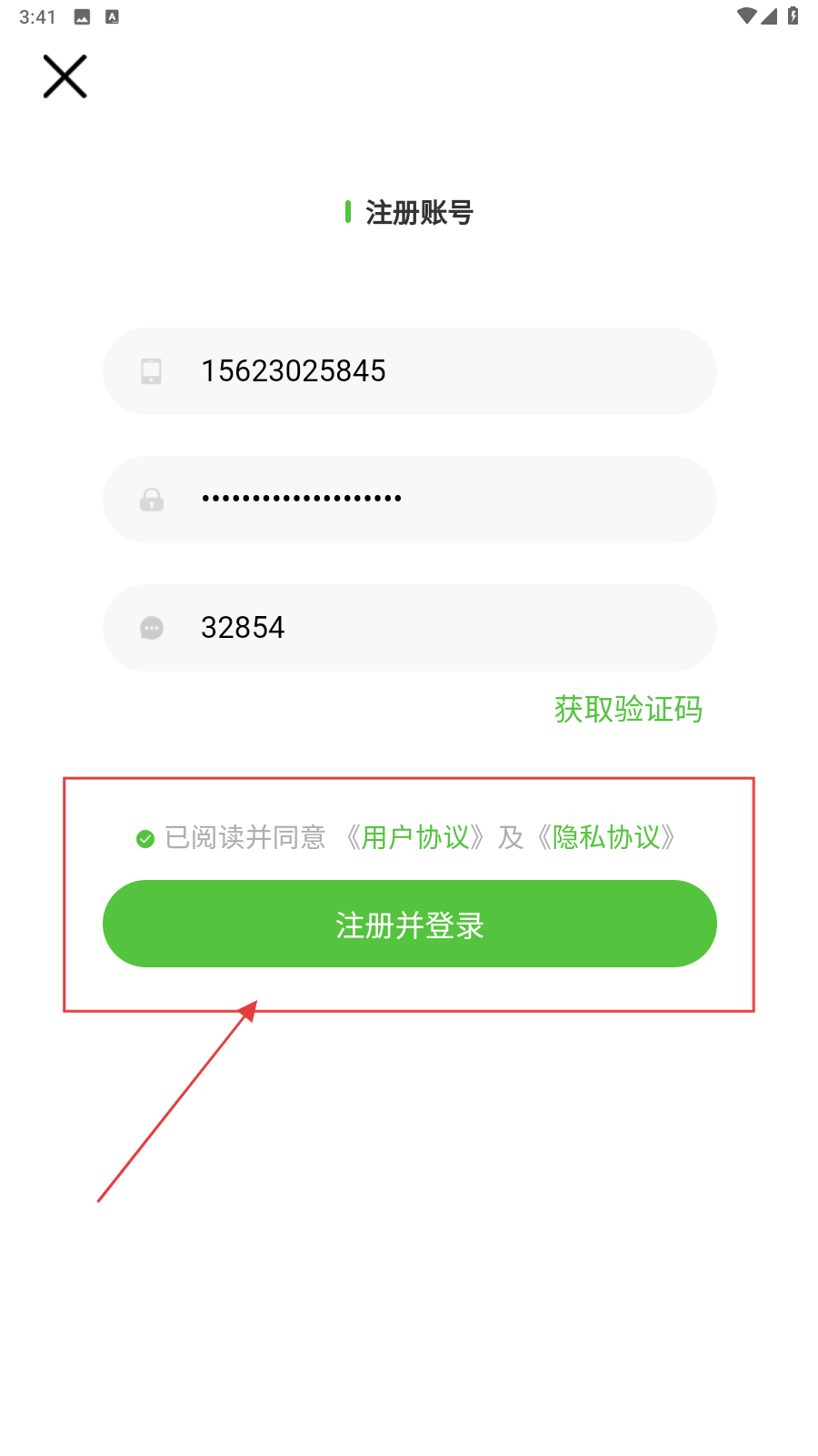 3、勾选协议,点击【注册并登录】,完成账号注册任务。