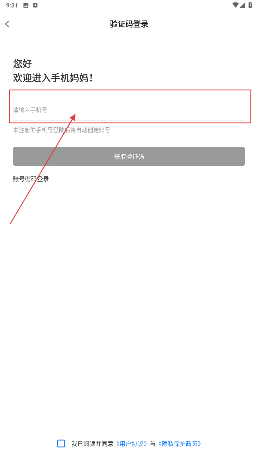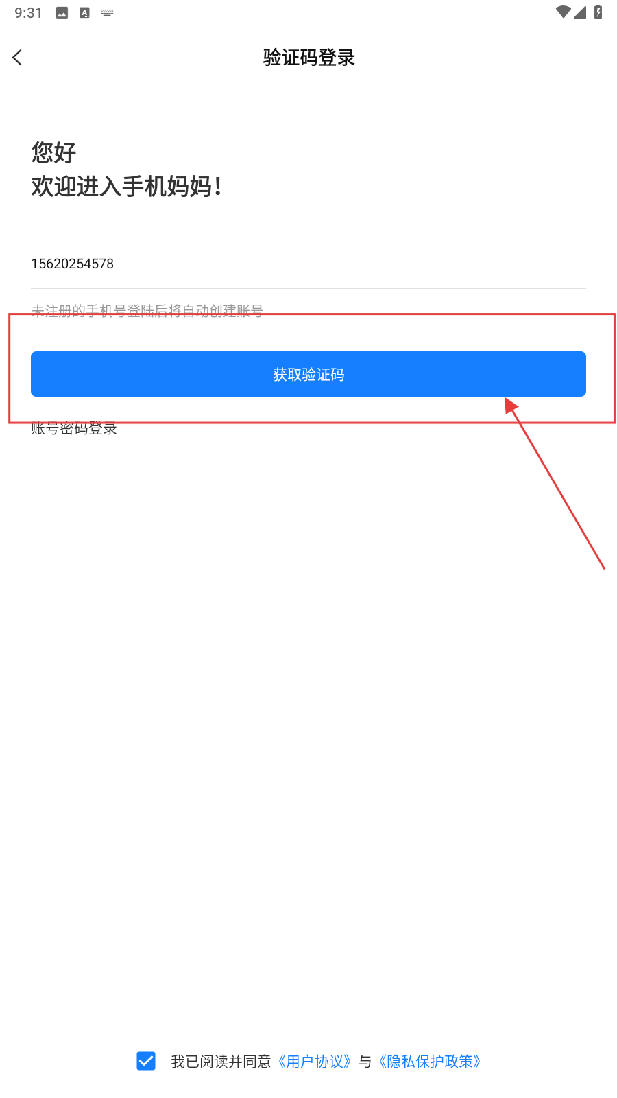 2、勾选协议,点击【获取验证码】,接收并填入验证码。