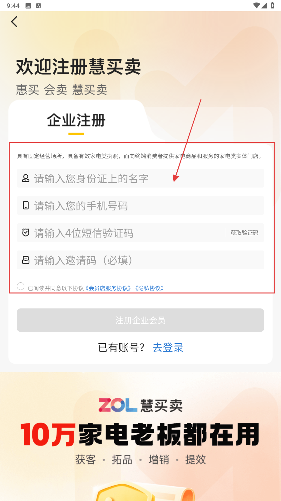 2、在企业注册页,填姓名、手机号,点【获取验证码】,填入收到的码,输入邀请码。