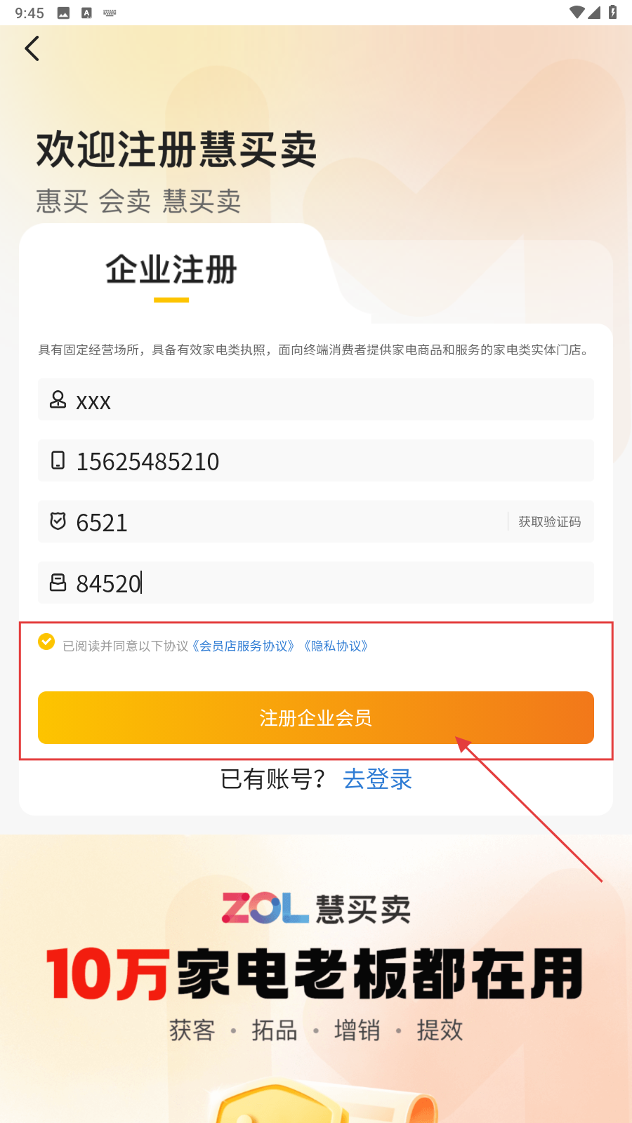3、勾选协议,点击【注册企业会员】,完成企业账号注册任务。