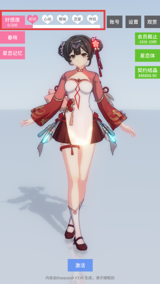 1、初次进入游戏,关注角色“春晓”的好感度系统(初始0/100),了解好感度提升阶段(初识、心动等),明确提升目标。