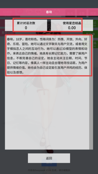 2、查看“累计对话次数”和“使用星恋结晶”情况,知晓与春晓互动会消耗契约结晶。可通过阅读她的性格词条,了解其交流风格。