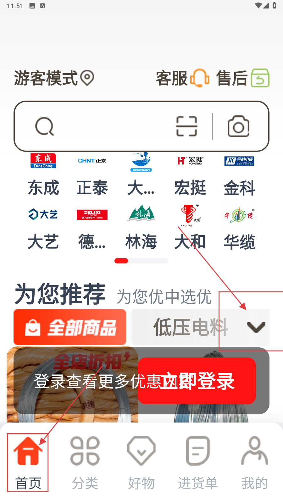 1、打开应用,在【首页】点击【低压电料】旁下拉箭头,展开分类。