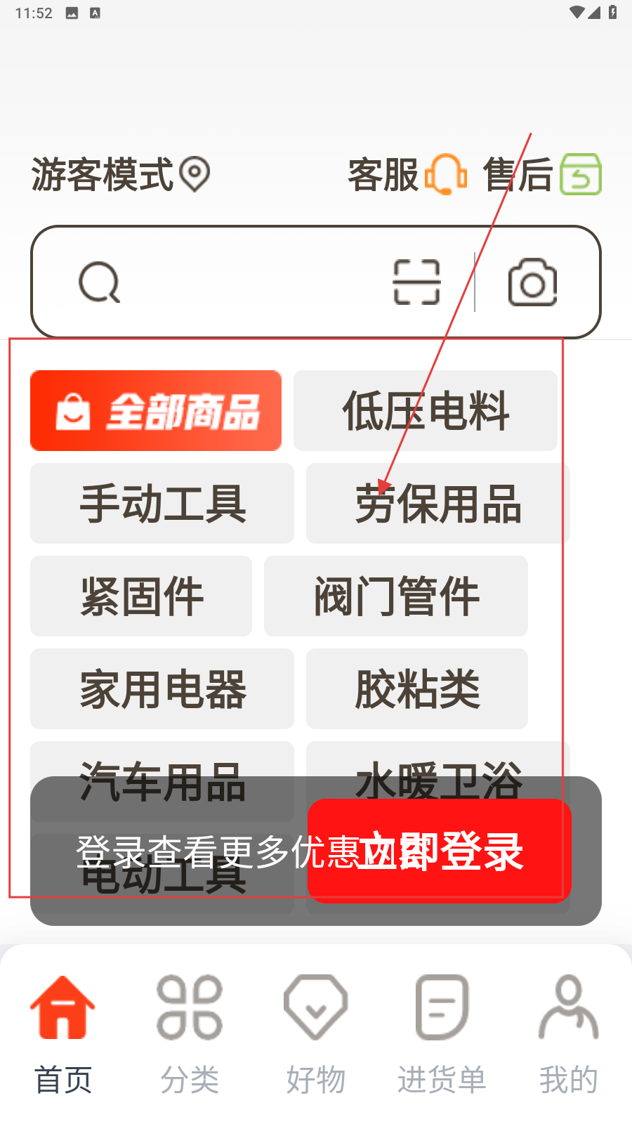 2、在展开的分类里,点击【劳保用品】,进入劳保用品浏览环节。