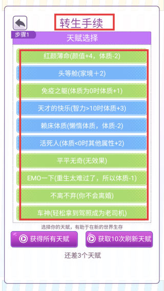 1、在“转生手续”的天赋选择阶段,仔细研读各天赋效果,根据游戏规划和偏好选择天赋。