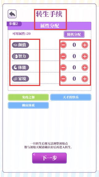 2、进入属性分配步骤,利用20点可用属性,根据所选天赋和发展方向,合理分配到颜值、智力、体能、家境属性上,也可选择“随机分配”。