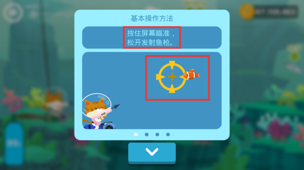1、进入游戏,牢记基本操作方法:按住屏幕瞄准,松开发射鱼枪,利用准星瞄准鱼类(如小丑鱼)进行捕捉。