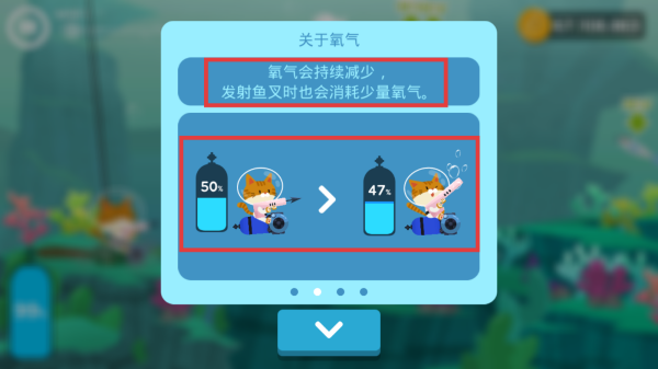 2、关注氧气状态,氧气会持续减少,发射鱼叉也会消耗少量氧气(如从50%降至47%),注意在氧气耗尽前补充或结束当前操作。