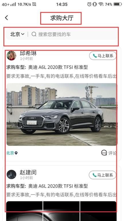 3、在【求购大厅】,选地区,查看求购列表,可以进行汽车交易。