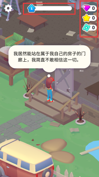 1、进入游戏,留意屏幕上方的房屋等级(如1级)以及钻石、星星、拼图碎片等资源数量,明确初始状态。