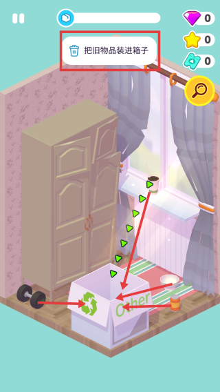 2、根据任务提示(如“把旧物品装进箱子”),在场景中找到对应旧物品(哑铃、杯子、罐子等),将其拖动到指定箱子里,完成收纳任务。