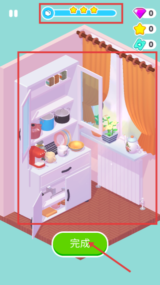 3、在整理房间任务中,按照合理的收纳逻辑摆放物品,争取获得三星评价,提升房屋等级。完成任务后点击“完成”,积累资源。