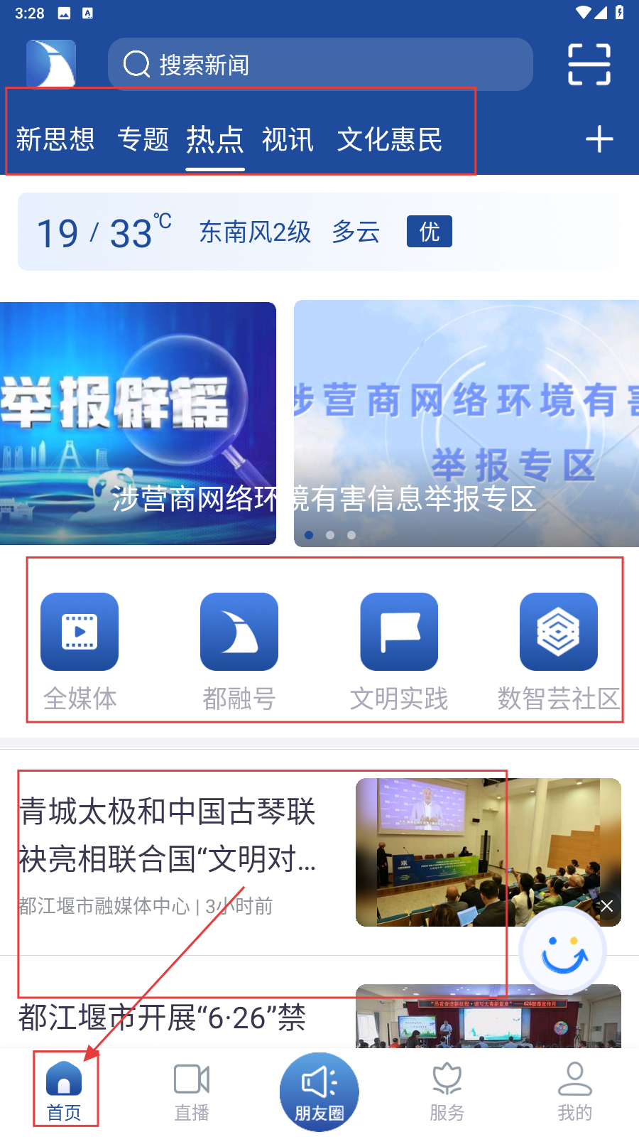 1、打开应用,在【首页】浏览新闻分类(新思想、专题等)和资讯(青城太极、禁毒等),进入内容浏览环节。