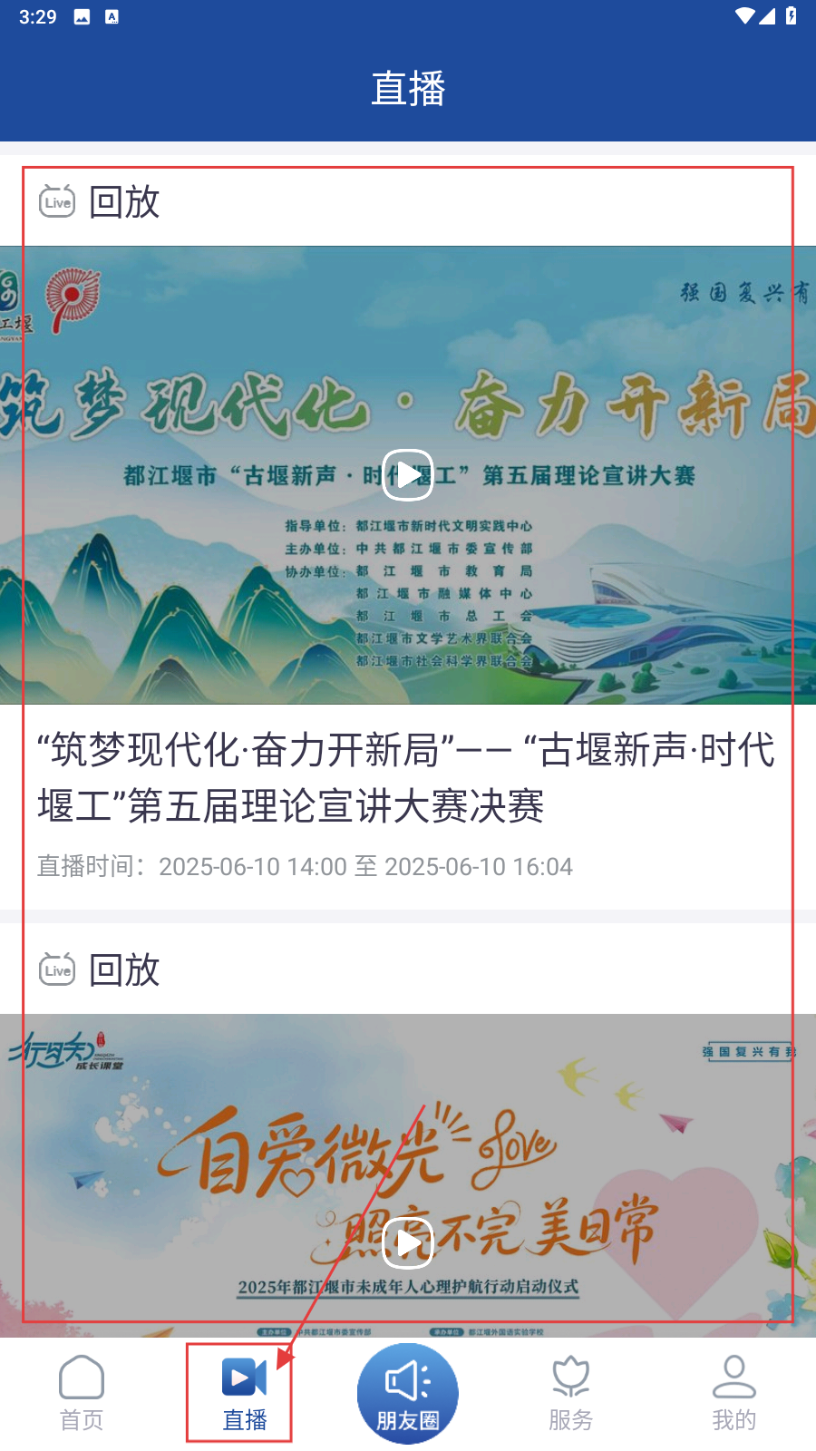 2、切换到【直播】页,查看直播回放(理论宣讲大赛、未成年人心理护航等),进行视听内容查看。