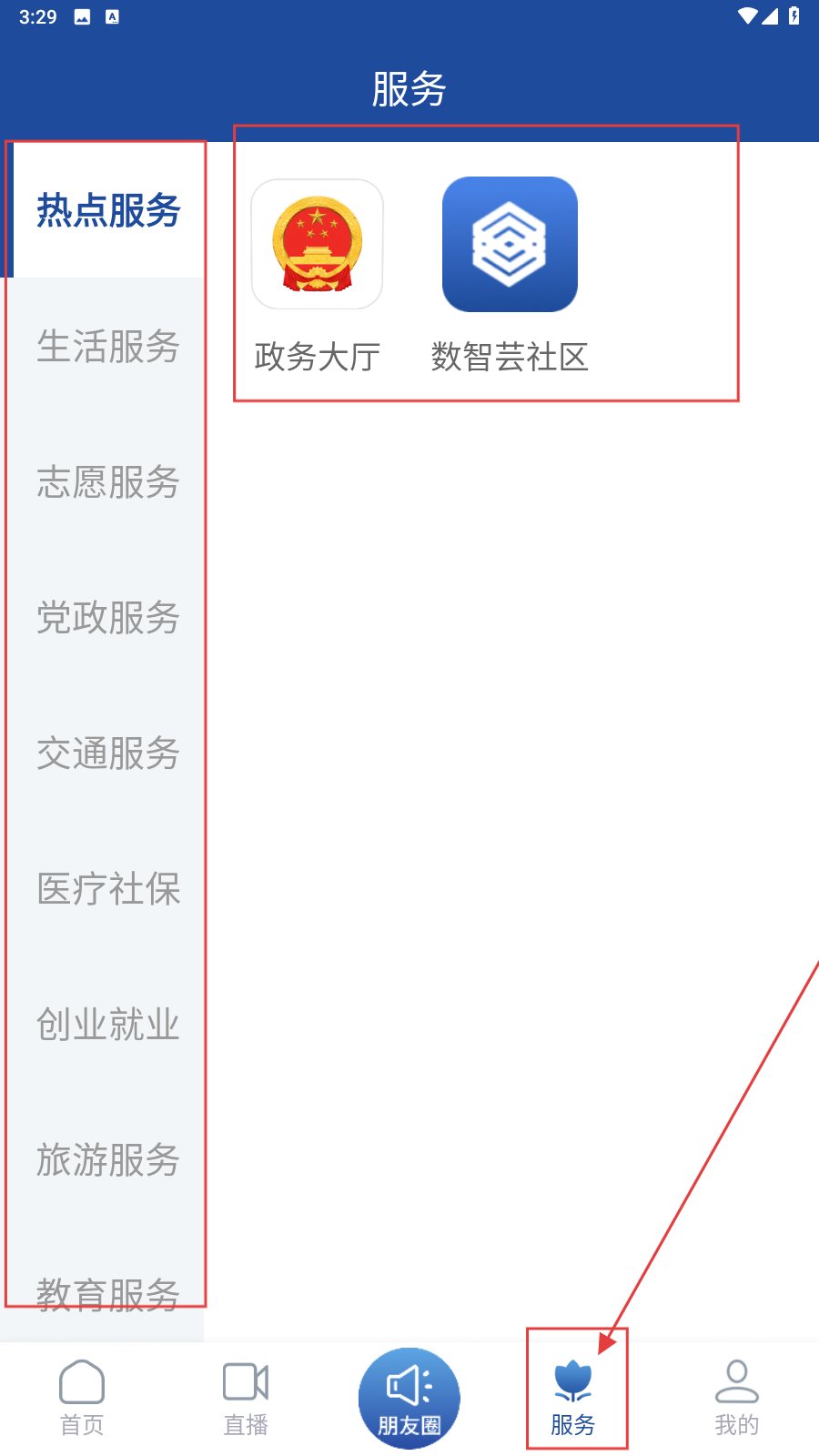 3、进入【服务】页,可以使用各类服务(政务大厅、数智芸社区、生活/志愿/党政等服务)。