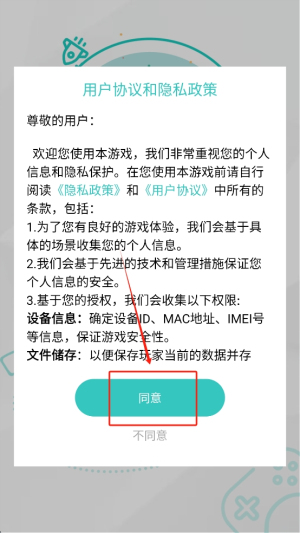 1、阅读用户协议和隐私政策,点击“同意”以继续游戏。