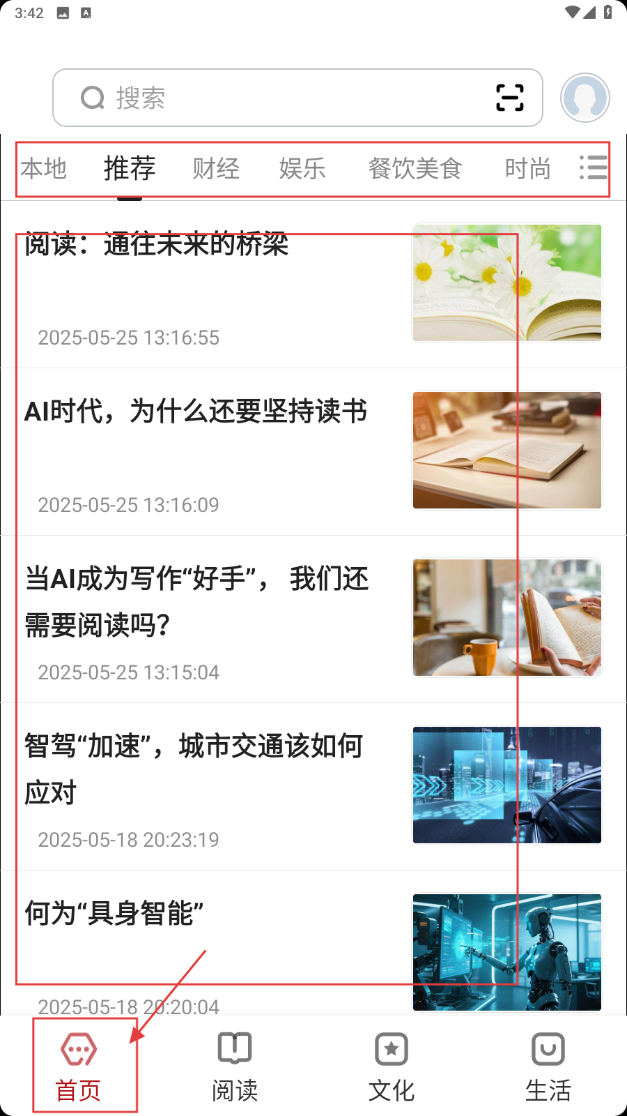 1、打开应用,在【首页】浏览新闻分类(本地、推荐等)及文章(阅读、AI、智驾相关),进入内容浏览环节。