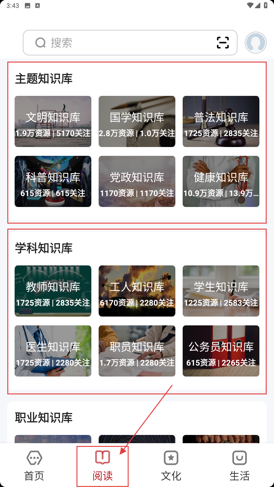 2、切换到【阅读】页,查看主题知识库(文明、国学等)和学科知识库(教师、工人等),完成知识浏览任务。