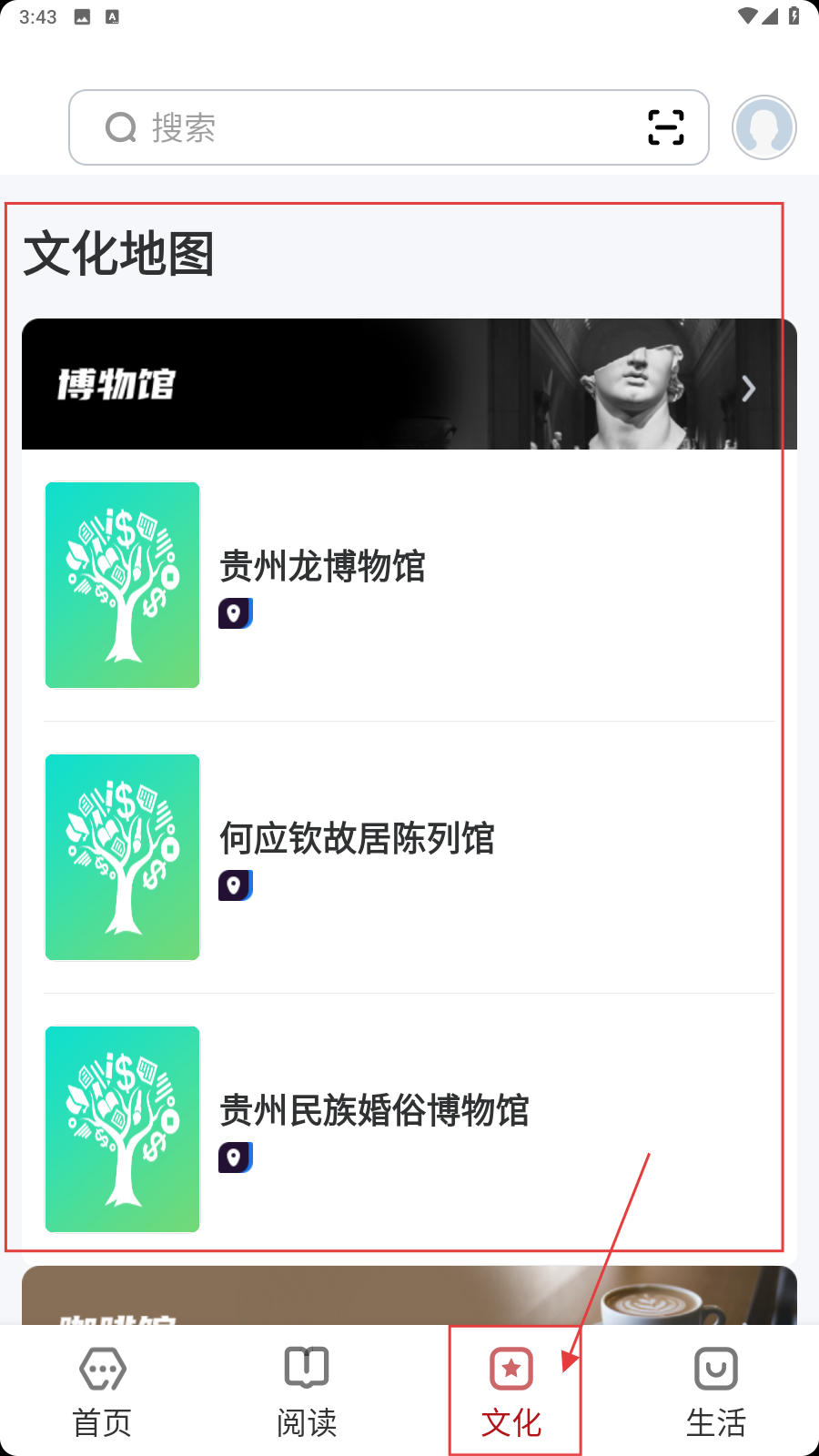 3、进入【文化】页,查看文化地图(贵州龙博物馆、何应钦故居等),完成文化场馆信息查看任务。
