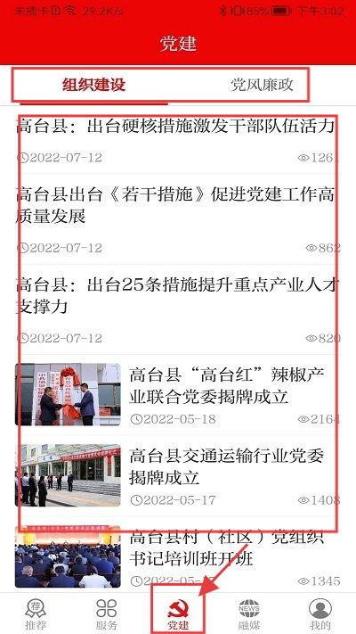 2、切换到【党建】页,查看组织建设、党风廉政相关内容,进行党建信息查看。
