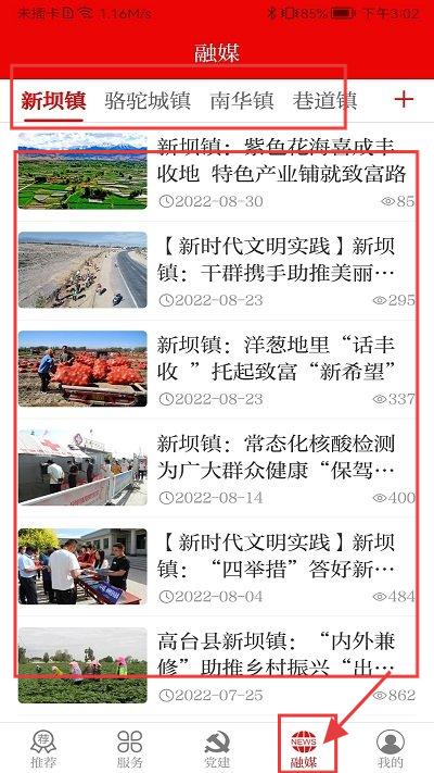 3、进入【融媒】页,浏览新坝镇、骆驼城镇等乡镇新闻,查看融媒内容。
