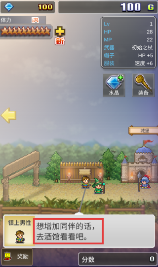 2、关注游戏中的提示信息(如“想增加同伴的话,去酒馆看看吧”),按照指引前往相应地点(酒馆),招募同伴,壮大队伍。
