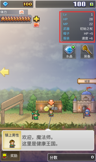 1、游戏开始,熟悉角色基础属性,包括等级(Lv1)、生命值(HP28)、魔法值(MP22)等,了解当前装备及其加成效果。