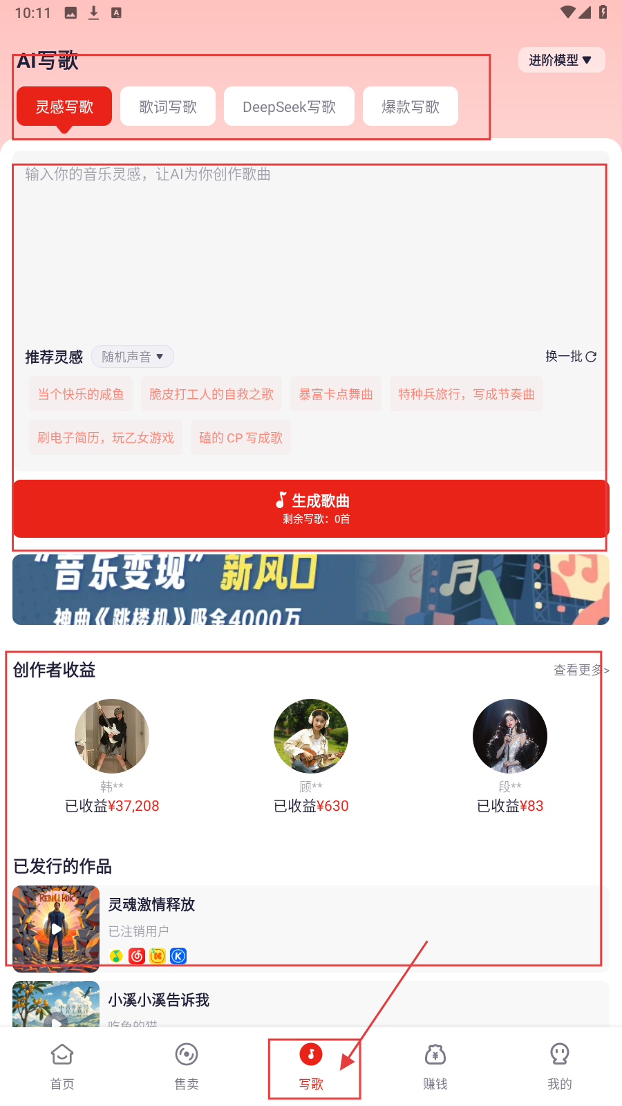 3、进入【写歌】页,选择AI写歌模式(灵感写歌、歌词写歌等),输入灵感/歌词,点击【生成歌曲】,即可进行AI写歌创作。