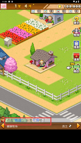 1、游戏开始,留意屏幕下方提示(如“点击‘商店’,设置花田吧!”),点击“商店”进入设施购买界面。