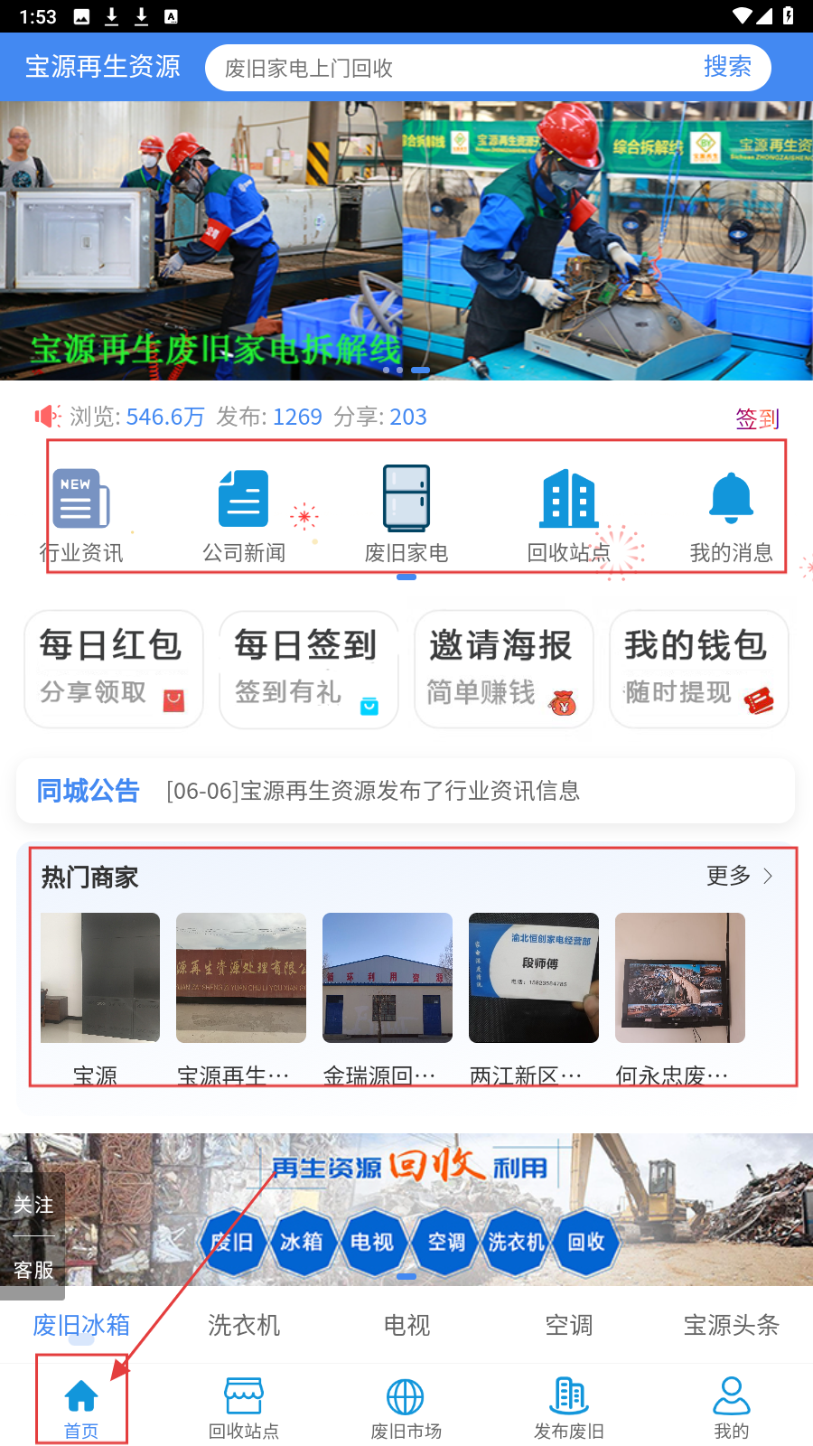 1、打开APP在【首页】可以查看行业资讯等,点击【回收站点】,进入站点页。