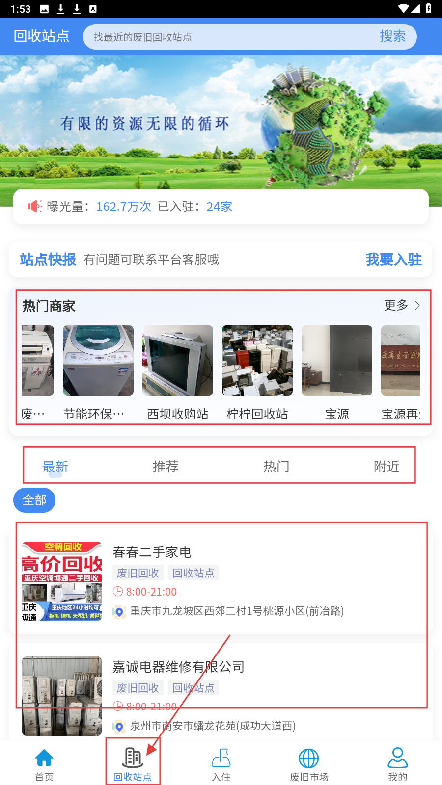 2、在【回收站点】页,可浏览热门商家、筛选(最新/推荐/热门/附近)站点,查看回收商家信息。