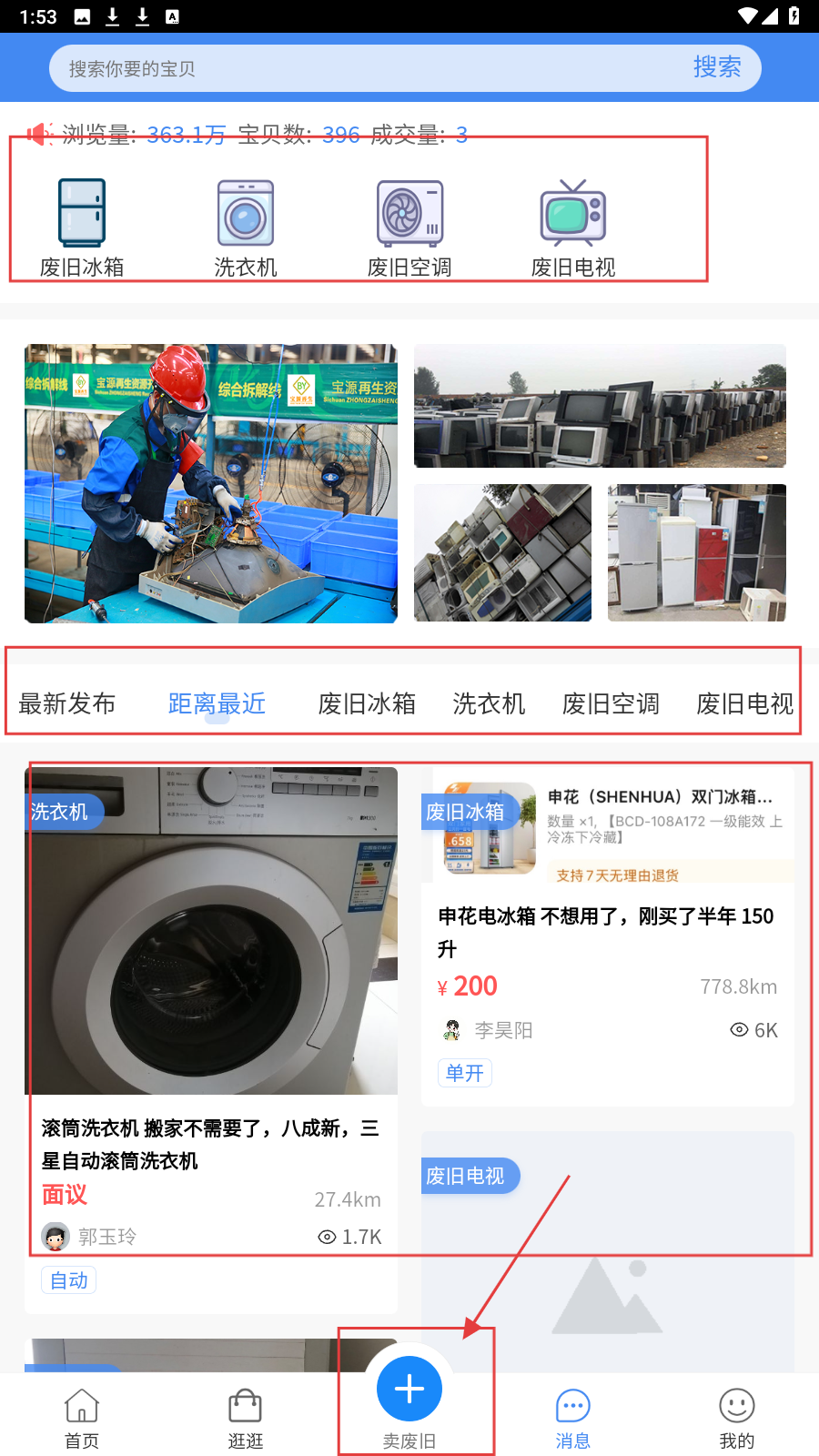 3、返回首页,点击【废旧时长】,可以进行查看附近的售卖信息,也可以自己发布售卖信息。