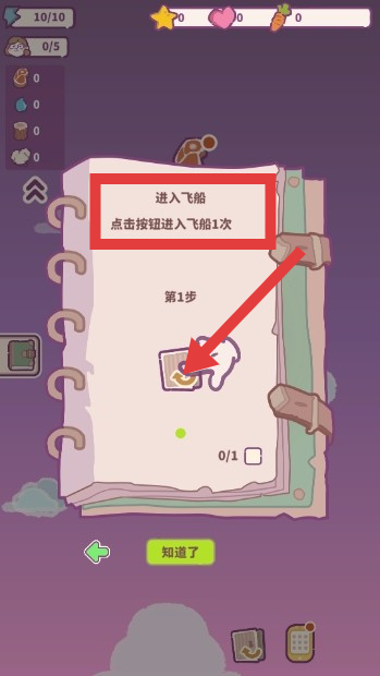 2、依据任务指引(如“进入飞船,点击按钮进入飞船1次”),找到对应按钮,点击完成进入飞船任务,开启新的游戏场景探索。