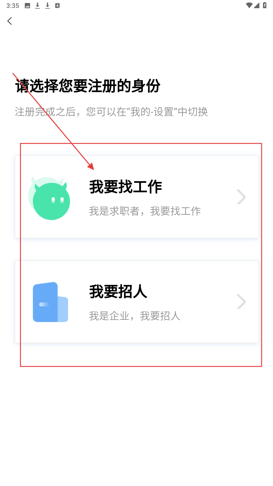 1、进入APP登录页,点击【马上注册】,选择身份(求职者选“我要找工作”,企业选“我要招人”)。