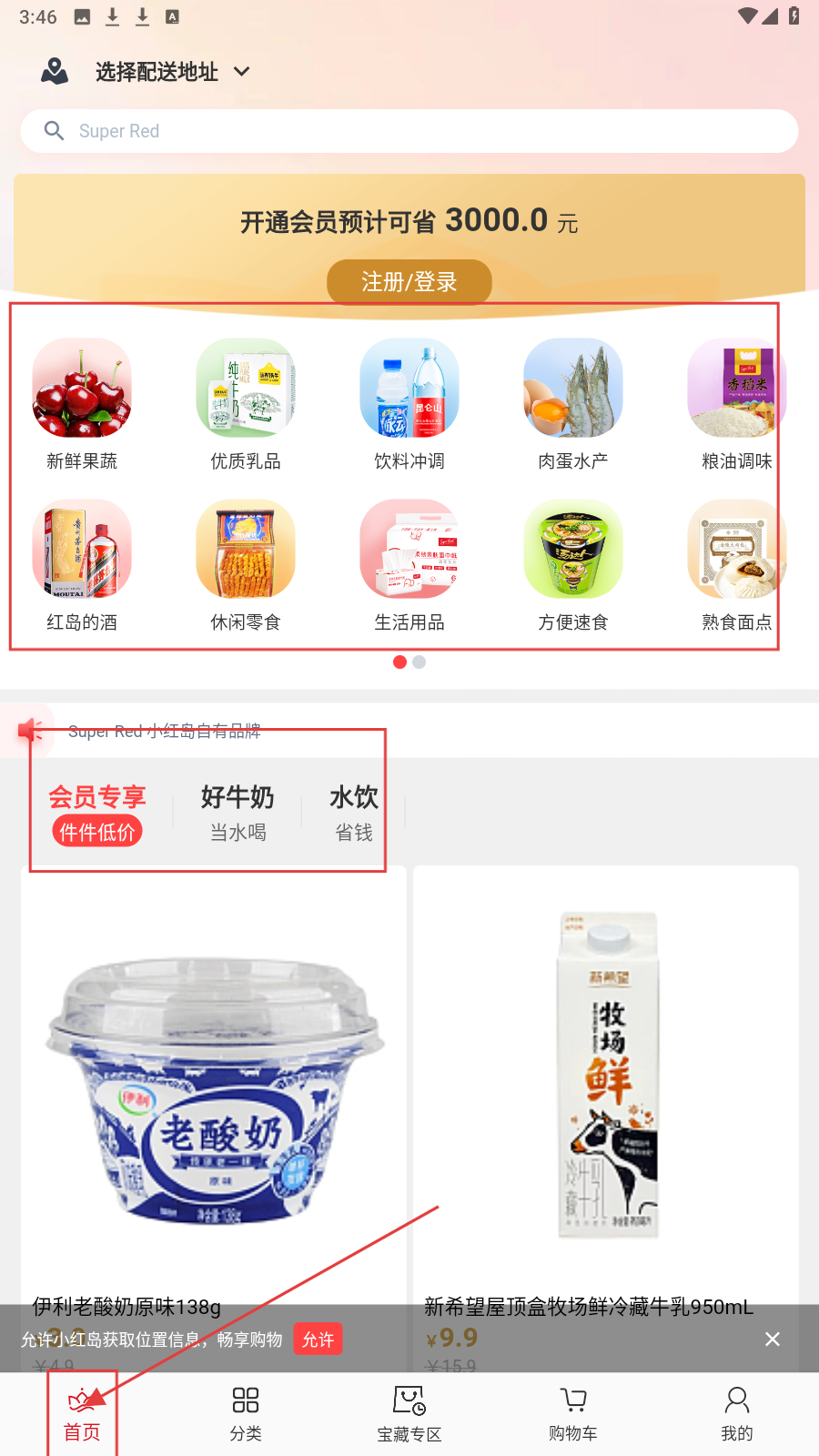 1、打开应用,在【首页】中,浏览分类(新鲜果蔬、优质乳品等)、专区(会员专享、好牛奶等)。