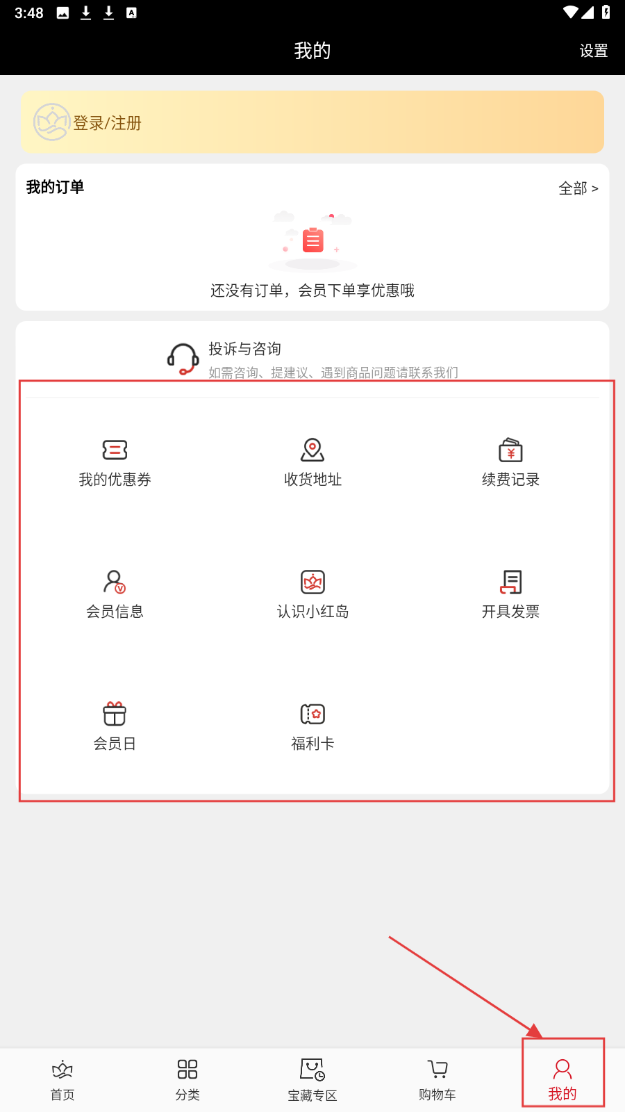 3、点击【我的】,可管理订单、优惠券、收货地址,查看会员信息、开具发票等,完成购物相关操作。